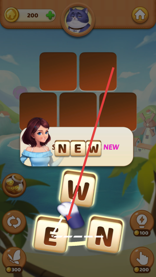 2、進入單詞解謎環(huán)節(jié),滑動字母拼單詞比如NEW,按照順序滑動,并填滿上方空格,完成關(guān)卡獲獎勵。