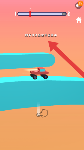 1、界面顯示第一個(gè)的場(chǎng)景,需要根據(jù)文字提示:向下滑動(dòng)會(huì)使車輪變小,可以根據(jù)障礙物進(jìn)行操作。