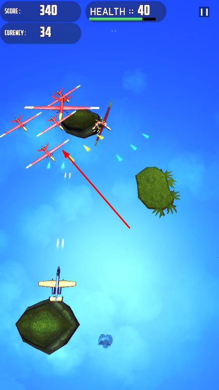 2、在場(chǎng)景中,操控戰(zhàn)斗機(jī)在空中飛行,通過(guò)虛擬操作按鈕,控制戰(zhàn)斗機(jī)的方向和射擊,攻擊其他紅色的敵機(jī)。