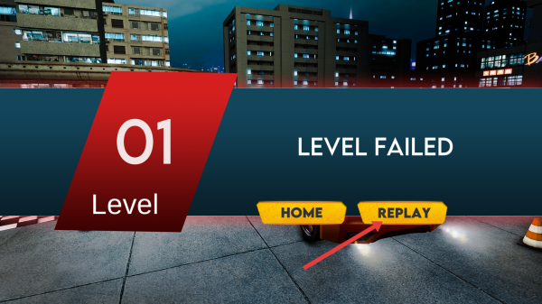 3、如果關(guān)卡失敗,可點擊REPLAY按鈕重新開始關(guān)卡,繼續(xù)挑戰(zhàn),也可點擊HOME按鈕返回主菜單,選擇其他關(guān)卡或進行其他操作。