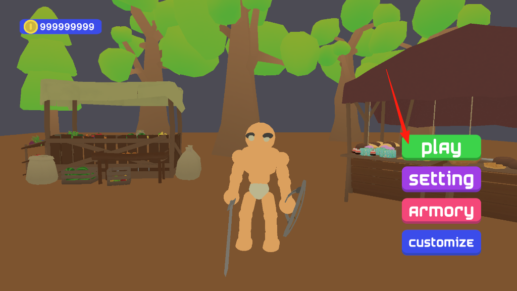 1、進入游戲主界面,看到play按鈕,點它開啟戰(zhàn)斗冒險,操控拿著武器的角色,在關(guān)卡里和敵人打架,用技能武器把對手都揍趴下,贏取獎勵。