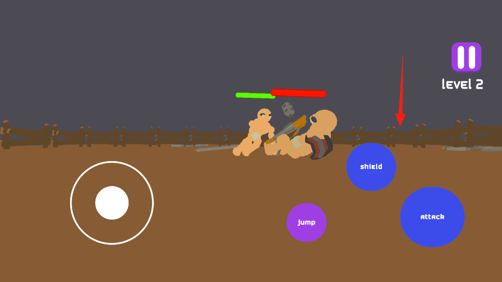 2、到了第二關(guān)戰(zhàn)斗場景,左邊搖桿控制移動,右邊有shield,jump,attack按鈕,遇到敵人點attack攻擊,靈活用jump躲攻擊,靠shield擋傷害,和對手拼操作贏戰(zhàn)斗。