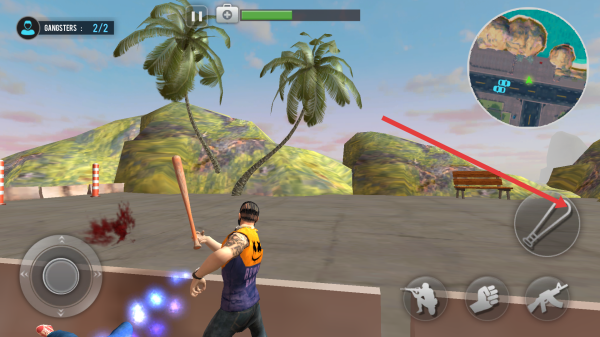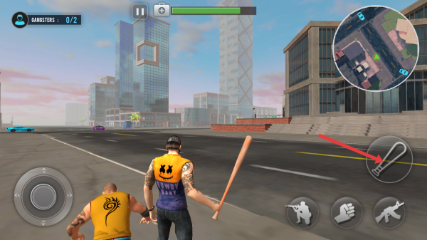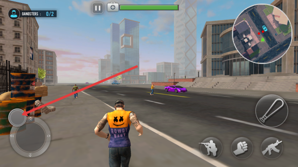 1、一進入街頭的場景,通過虛擬搖桿移動角色,小地圖紅點標記目標黑幫成員位置,優(yōu)先靠近。