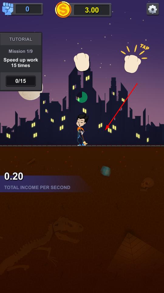 1、屏幕上方閃爍TAP提示的拳頭區(qū)域,同步推進(jìn)左側(cè)教程任務(wù)Speed up work 15 times的進(jìn)度條,底部TOTAL INCOME PER SECOND數(shù)值隨點(diǎn)擊頻次逐步增長,積累初始收益。