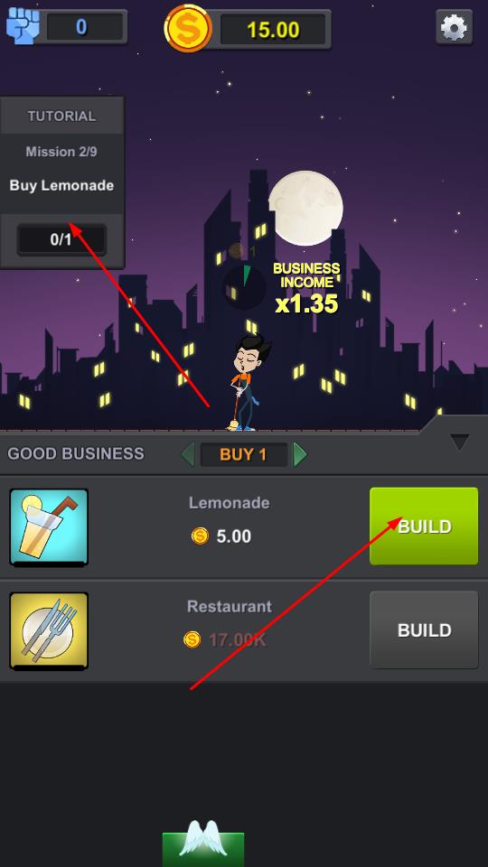 2、解Buy Lemonade任務(wù),下滑界面GOOD BUSINESS板塊,點(diǎn)擊Lemonade項目右側(cè)綠色BUILD按鈕,消耗5.00金幣完成建筑解鎖,擴(kuò)大每秒收益。