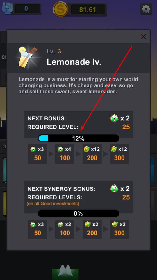 3、點(diǎn)擊已建Lemonade建筑圖標(biāo),彈出詳情界面,聚焦Lemonade Lv.信息欄,觀察NEXT BONUS下方進(jìn)度條如12%,統(tǒng)籌升級所有Good investments類建筑,觸發(fā)協(xié)同收益加成。