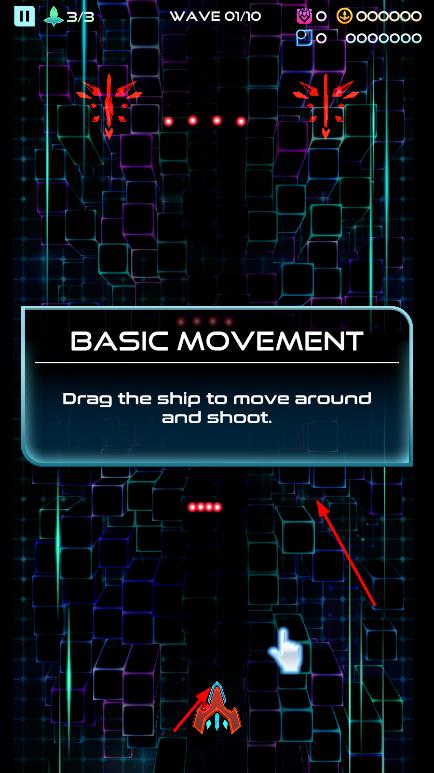 1、進(jìn)入游戲,在初始界面,根據(jù)提示拖動(dòng)飛船移動(dòng)并射擊,開(kāi)始游戲。