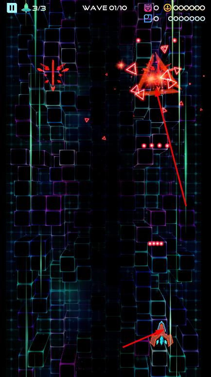 2、在場(chǎng)景中,手指拖動(dòng)屏幕下方的飛船,控制其移動(dòng)方向,躲避敵人的攻擊,并向敵人發(fā)射子彈進(jìn)行射擊。
