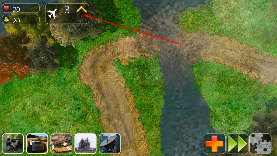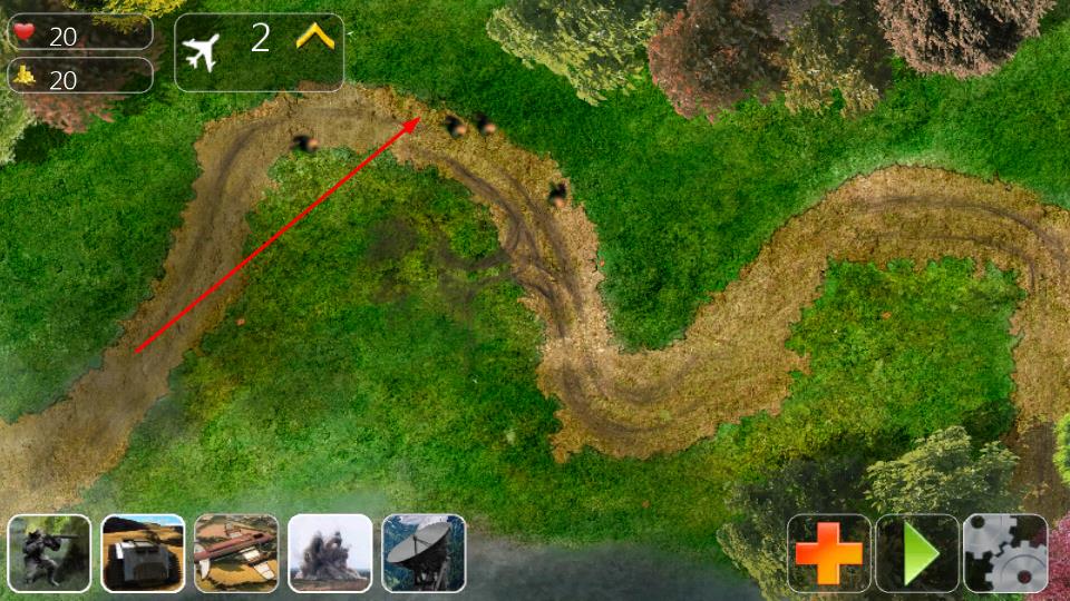 1、開局部署階段,觀察頂部生命20、金幣20及空襲次數(shù)飛機(jī)圖標(biāo),敵人沿彎曲路徑進(jìn)犯,點(diǎn)擊下方單位(士兵、坦克等布置防線。