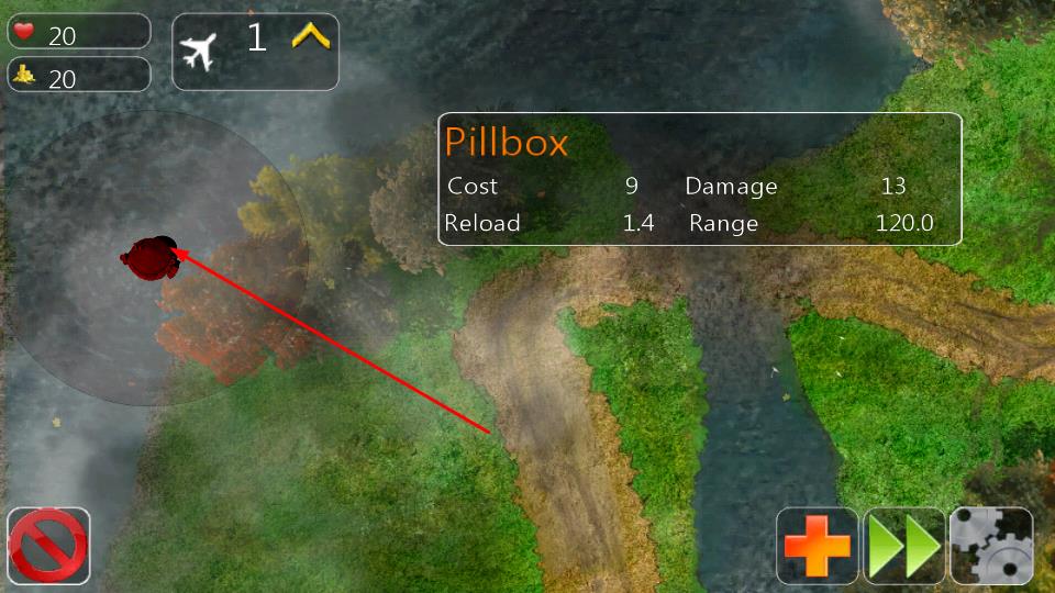 3、查看建筑屬性如Pillbox:花費(fèi)9、傷害13、射速1.4、射程120,擇機(jī)安置防御建筑,覆蓋敵人路徑輸出傷害。