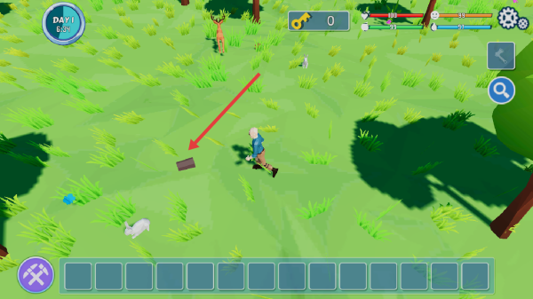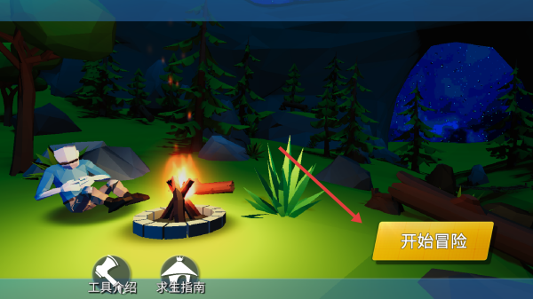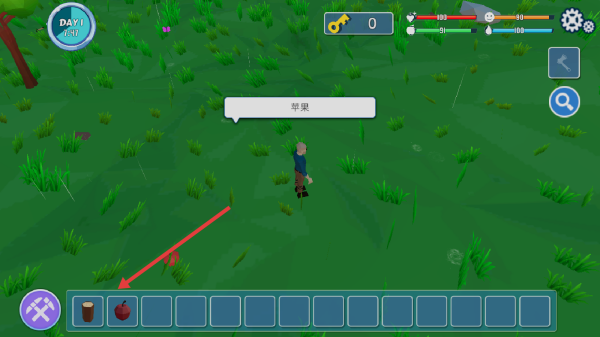 1、點擊主界面開始冒險,進入生存場景,操控角色在草地探索,收集木材、蘋果等基礎(chǔ)資源。