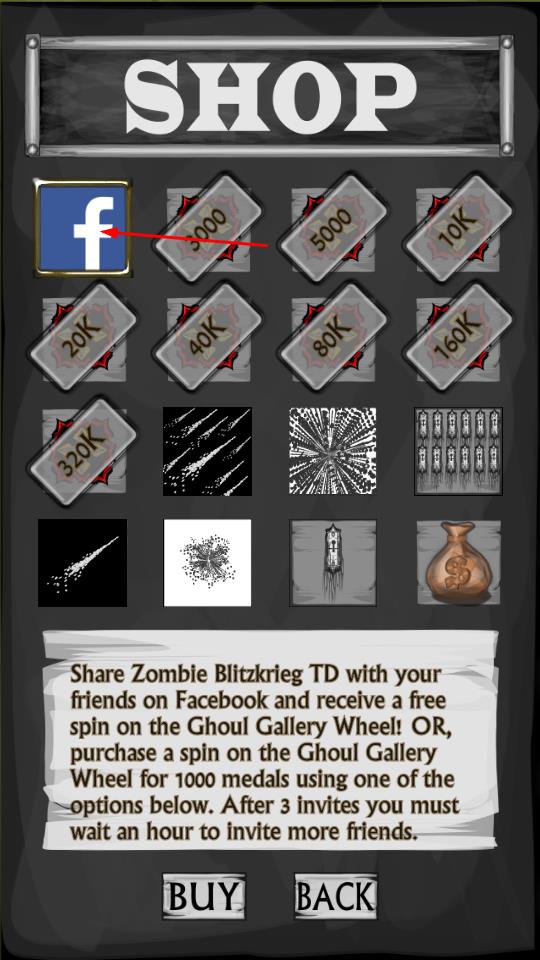 3、在SHOP界面,點擊Facebook圖標(biāo)分享游戲,可獲Ghoul Gallery Wheel免費旋轉(zhuǎn)機(jī)會,也可選擇3000、5000等medals額度,購買旋轉(zhuǎn)次數(shù),按提示操作。