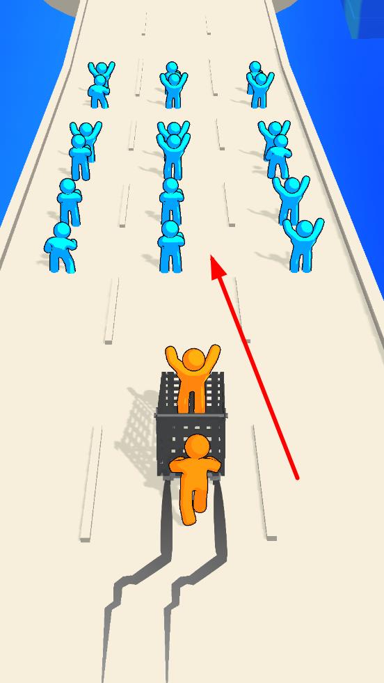 1、進入關卡,操控橙色角色推小車前進,吸納藍色人群,規(guī)劃藍色人群多的路線,優(yōu)先收集,快速擴充隊伍規(guī)模。