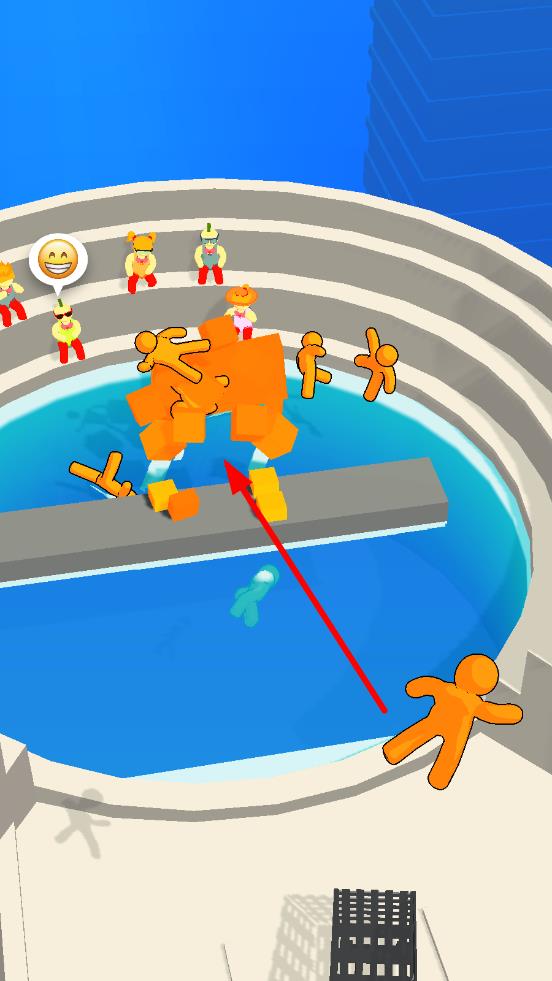 2、集滿人群后進入競技場,將小車上的人群全都往前推,撞開前面的方塊墻面,座位上的觀眾會給出評分。