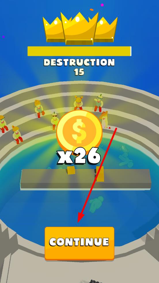 3、評價足夠高的話,將會獲得三星的評價,顯示DESTRUCTION評分與金幣獎勵,點擊CONTINUE進入下一關。