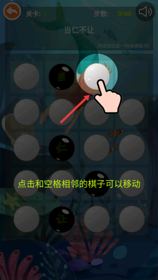 1、根據(jù)游戲提示,點(diǎn)擊與空格相鄰的棋子進(jìn)行移動(dòng),嘗試將當(dāng)仁不讓連成一列,完成當(dāng)仁不讓關(guān)卡。