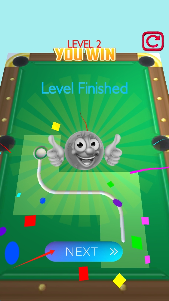 3、通關(guān)后,點擊NEXT,迎接更復(fù)雜的下一關(guān),不斷提升臺球進洞的技巧和策略。