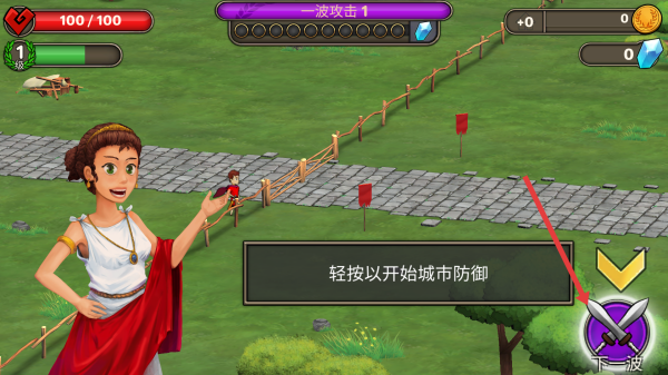 1、游戲開始時(shí),點(diǎn)擊界面上標(biāo)有下一波的按鈕,即可開始城市防御任務(wù),迎接敵人的攻擊。