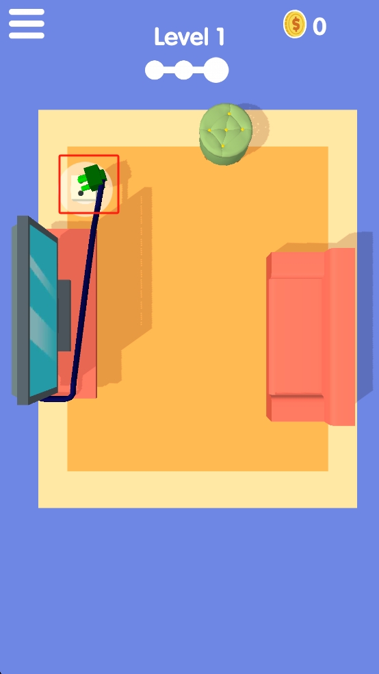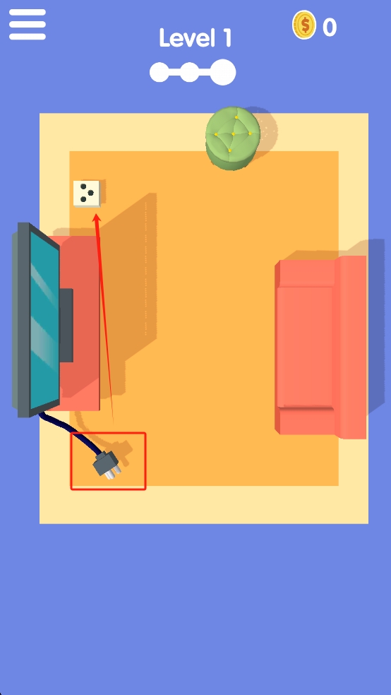 1、觀察場(chǎng)景,找到紅色框內(nèi)的插頭,順著紅色指引線方向,將其拖動(dòng)至對(duì)應(yīng)插座位置,注意避開家具障礙。