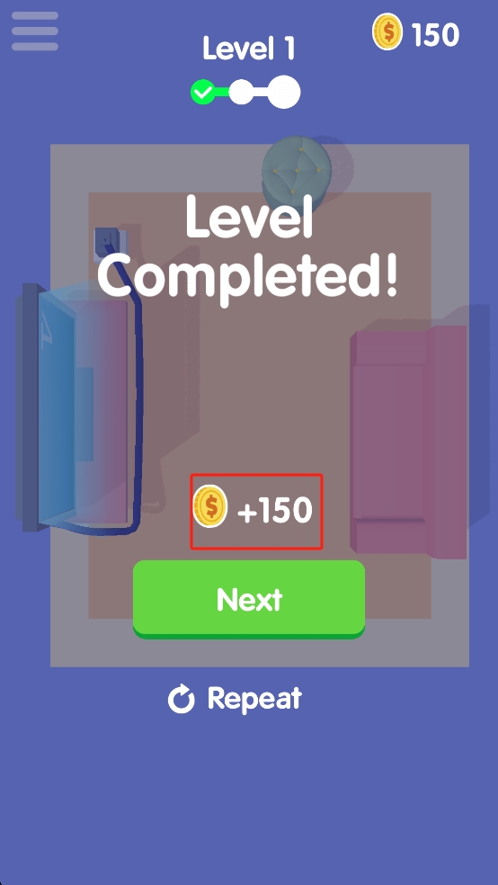 3、關(guān)卡勝利后獲得150金幣,點(diǎn)擊綠色的Next按鈕,即可進(jìn)入下一關(guān),繼續(xù)挑戰(zhàn)新的插頭連接任務(wù)。
