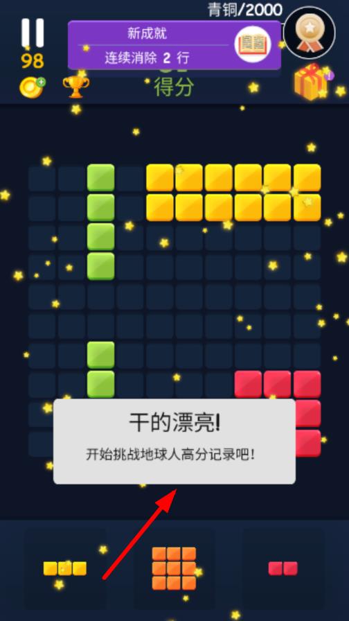 2、多行消除策略:觀察方塊形狀與位置,嘗試同時消除兩行或多行,利用方塊下落的連貫性形成連擊,快速積累分數(shù)。