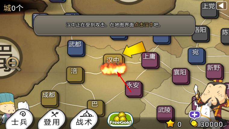 1、進(jìn)入游戲,當(dāng)收到城池受攻擊提示,如漢中正在受到攻擊,在地圖界面點(diǎn)擊受攻擊的城池。