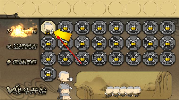 2、進(jìn)入戰(zhàn)斗準(zhǔn)備界面,依次選擇士兵、武將、技能,合理搭配戰(zhàn)斗陣容,完成準(zhǔn)備后點(diǎn)擊戰(zhàn)斗開始。