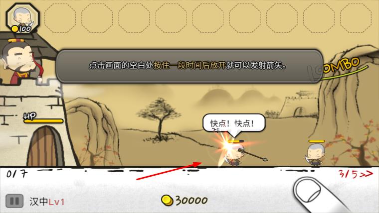 3、在戰(zhàn)斗界面,點(diǎn)擊畫面空白處并按住一段時(shí)間后放開,發(fā)射箭矢攻擊敵人,成功抵御敵人進(jìn)攻,守護(hù)城池。
