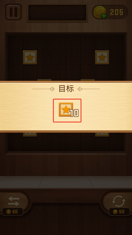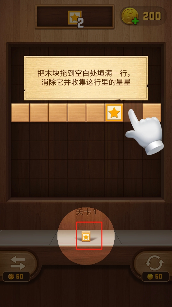 2、依據(jù)指引,將帶星星的木塊拖至對應(yīng)行空白位置,通過填滿一行來消除并收集星星,優(yōu)先選擇缺塊少的行填充。