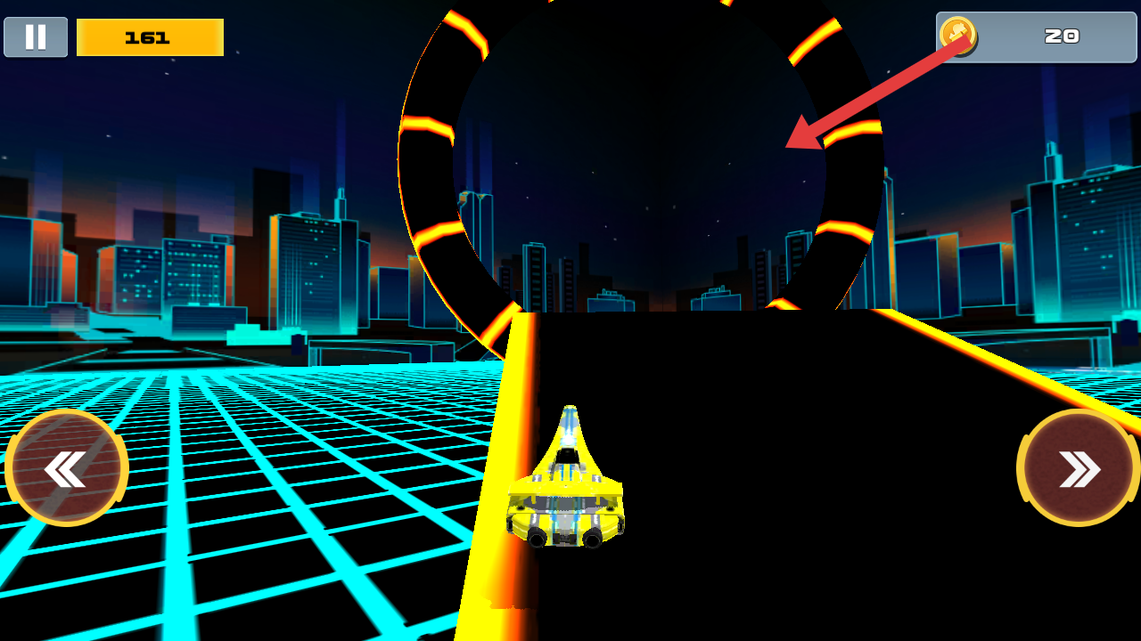2、在游戲中操控賽車穿越這些環(huán)形賽道,注意方向控制,同時拾取賽道周圍金幣,積累資源。