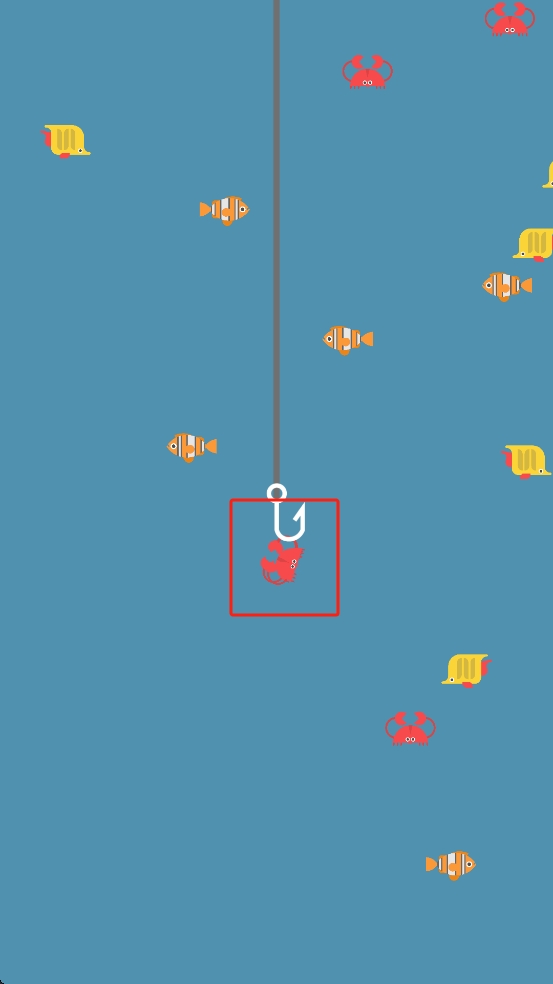 1、操控魚鉤移動,對準(zhǔn)紅色螃蟹位置,讓魚鉤接觸螃蟹完成捕獲,注意避開其他魚類干擾,穩(wěn)定釣起目標(biāo)。