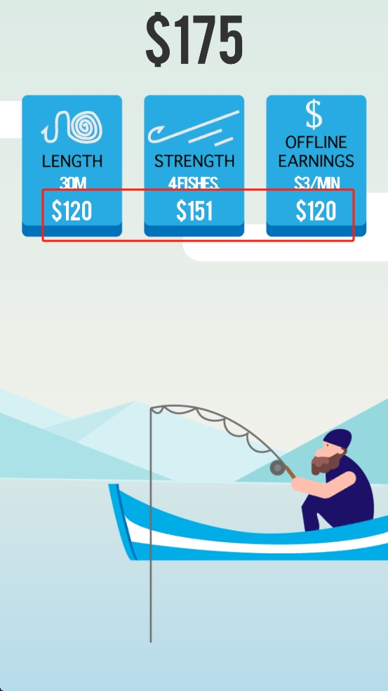 2、獲得金幣達(dá)到175后,根據(jù)需求選擇升級項,若想釣更深更遠(yuǎn),優(yōu)先點LENGTH,追求釣更重的魚。
