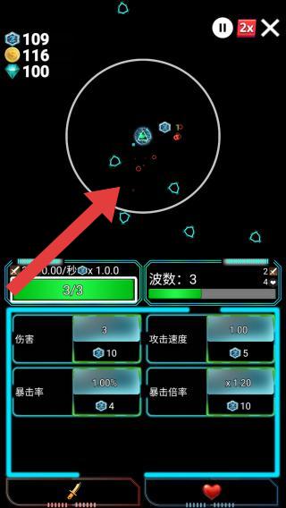2、進入到游戲場景內(nèi),顯示總波數(shù)為3,玩家需要攻擊3波敵人,可觀察傷害、攻擊速度以及暴擊率。