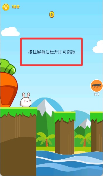 1、進(jìn)入游戲后,通過點(diǎn)擊任意位置控制小兔子的跳躍,目標(biāo)是不斷前行,安全避開各種障礙與陷阱。