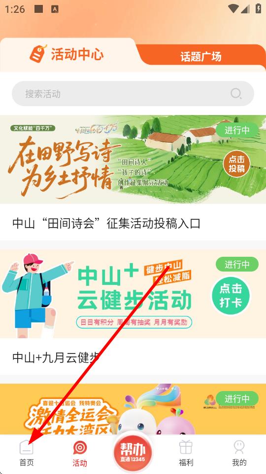 1、打開中山日報app,點擊底部導(dǎo)航欄中的首頁進(jìn)入首頁界面。
