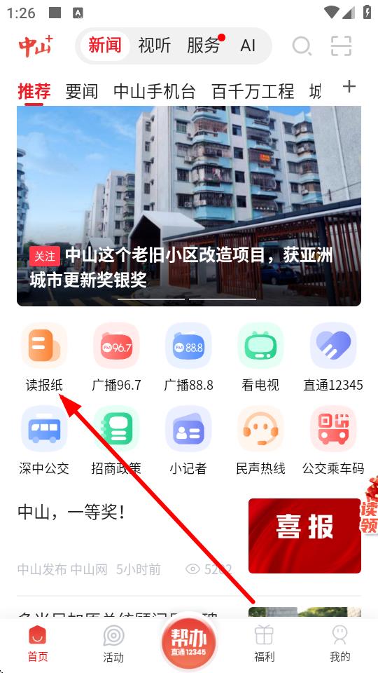 2、在首頁界面找到讀報紙欄目,點擊進(jìn)入。