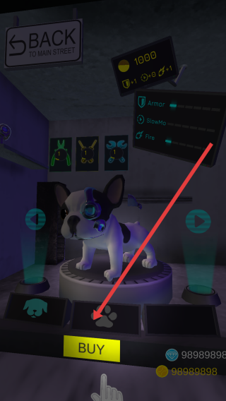 1、點(diǎn)擊界面底部爪印圖標(biāo)旁的BUY按鈕,購買機(jī)械狗角色,解鎖該角色用于后續(xù)游戲。