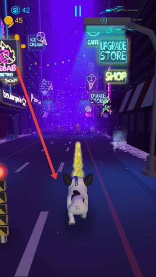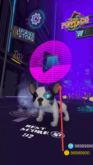 3、操控機(jī)械狗在霓虹街道奔跑,收集沿途金幣等道具,注意躲避障礙,提升游戲得分。