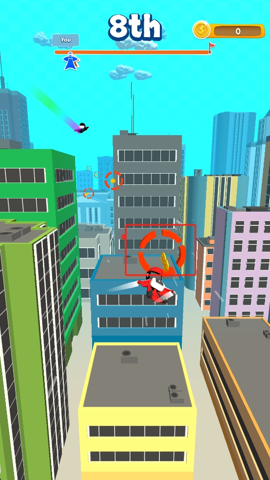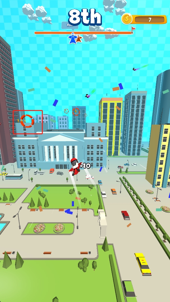 2、俯沖城市區(qū)域時(shí),瞄準(zhǔn)紅色圓環(huán)快速穿越,沿途拾取金幣,留意地面建筑、車輛等,保持飛行節(jié)奏,超越其他角色提升排名。