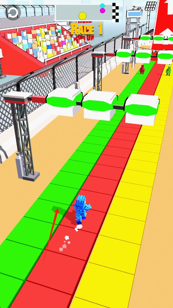 2、游戲中,操控方塊英雄,沿跑道躲避障礙,靈活沖刺,爭取領先,點擊屏幕人物跑動。