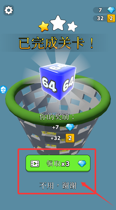 3、通關(guān)后彈出獎勵界面,可選觀看廣告獲取豐厚獎勵或直接領(lǐng)取基礎(chǔ)收益。