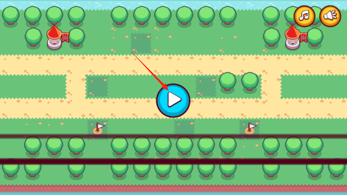 1、點(diǎn)擊中間藍(lán)色的播放按鈕,就能開始游戲啦,進(jìn)入游戲后,應(yīng)該會在這個(gè)有樹木和路徑的場景里,操控角色或者進(jìn)行一些策略操作,開啟冒險(xiǎn)。