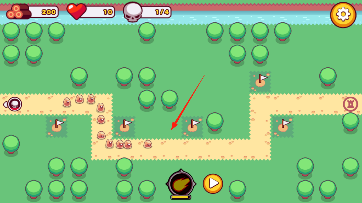 3、進(jìn)入游戲場景后,能看到路徑上有一些小怪物,還有插著旗幟的目標(biāo)點(diǎn),操控游戲里的元素,去應(yīng)對這些小怪物,同時(shí)朝著旗幟目標(biāo)點(diǎn)前進(jìn),完成關(guān)卡任務(wù)。