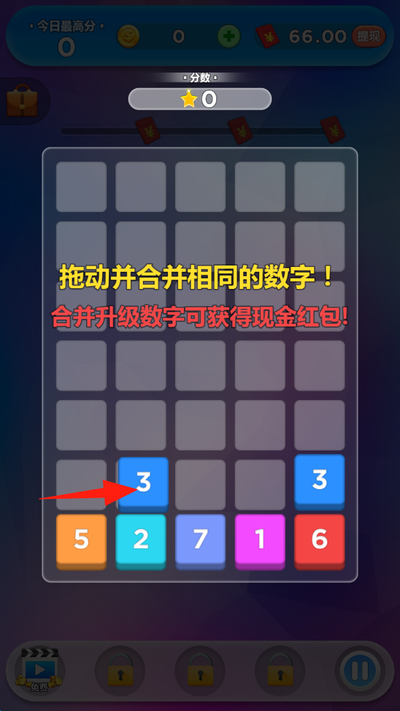 1、拖動(dòng)相同數(shù)字方塊如藍(lán)色3合并,升級(jí)數(shù)字,獲取現(xiàn)金紅包,提升分?jǐn)?shù),滑動(dòng)消除相同。