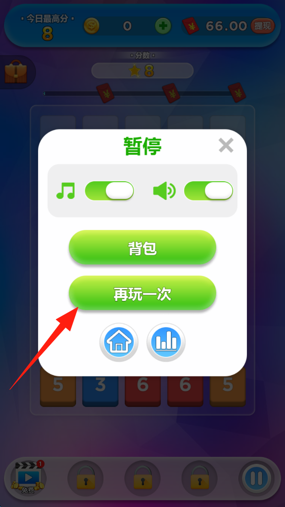 3、點(diǎn)擊暫停界面再玩一次,重新開始Level-1,嘗試更高分?jǐn)?shù)與紅包收益,點(diǎn)擊按鈕重玩。