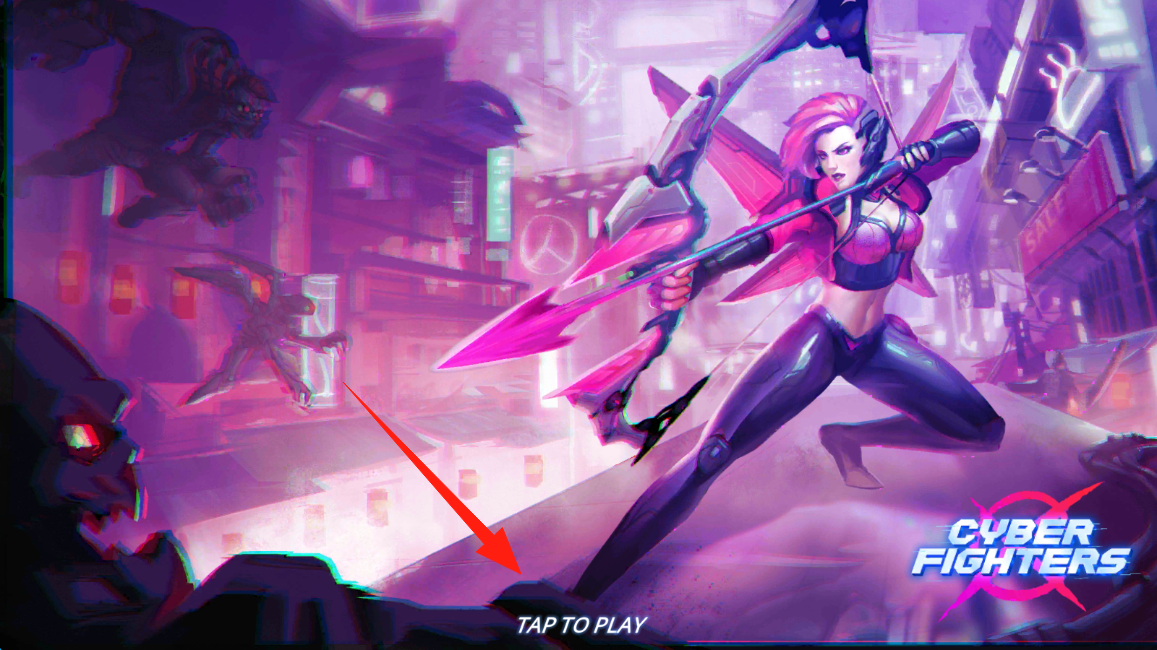 1、在游戲啟動(dòng)界面,點(diǎn)擊TAP-TO-PLAY,進(jìn)入Cyber-Fighters的賽博戰(zhàn)斗世界,點(diǎn)擊開始游戲。