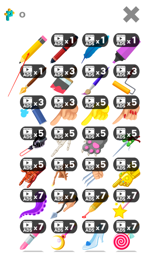 3、進(jìn)入工具界面,點(diǎn)擊不同畫筆如鉛筆、羽毛筆等觀看廣告可解鎖使用,不同畫筆用于填色操作。