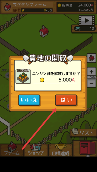 3、彈出農(nóng)地の開(kāi)放確認(rèn)框后,點(diǎn)擊橙色はい按鈕,花費(fèi)5000金幣解鎖洋蔥田,拓展種植區(qū)域,助力農(nóng)場(chǎng)進(jìn)一步發(fā)展。