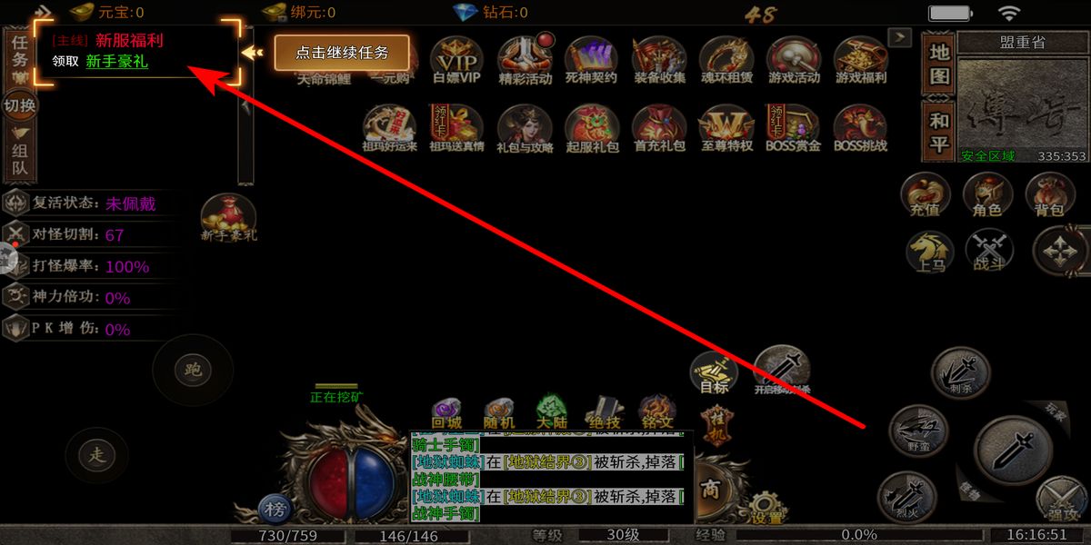 2、進(jìn)主界面接新服福利任務(wù),點(diǎn)點(diǎn)擊繼續(xù)任務(wù)推進(jìn),領(lǐng)新手豪禮獲資源,按主線指引打怪升級,積累元寶、綁元等,強(qiáng)化基礎(chǔ)實(shí)力。