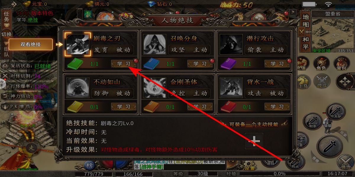 3、達(dá)30級解鎖人物絕技,選劇毒之刃等技能學(xué)習(xí),依據(jù)職業(yè)定位搭配主動被動絕技,提升打怪切割傷害,合理分配技能書,優(yōu)化戰(zhàn)斗能力。